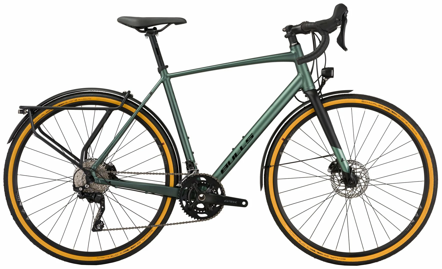 6061 Alu d.b. Rahmen mit tapered Steuerrohr, Carbon Aero-Gabel, Shimano GRX-400 20-Gang Compact Schaltung mit hydr. Scheibenbremsen, GRX-600 Kurbeln 30-46 mit Hollowtech-II Innenlager, 11-36 Zahnkranz, Schwalbe G-One Allround Reifen (40-622), XC-21 Disc Felgen, KT Nabendynamo, Bumm Lumotec IQ-XS Lampe, RL-Mini Rücklicht, Oversized Lenker, Cork Lenkerband