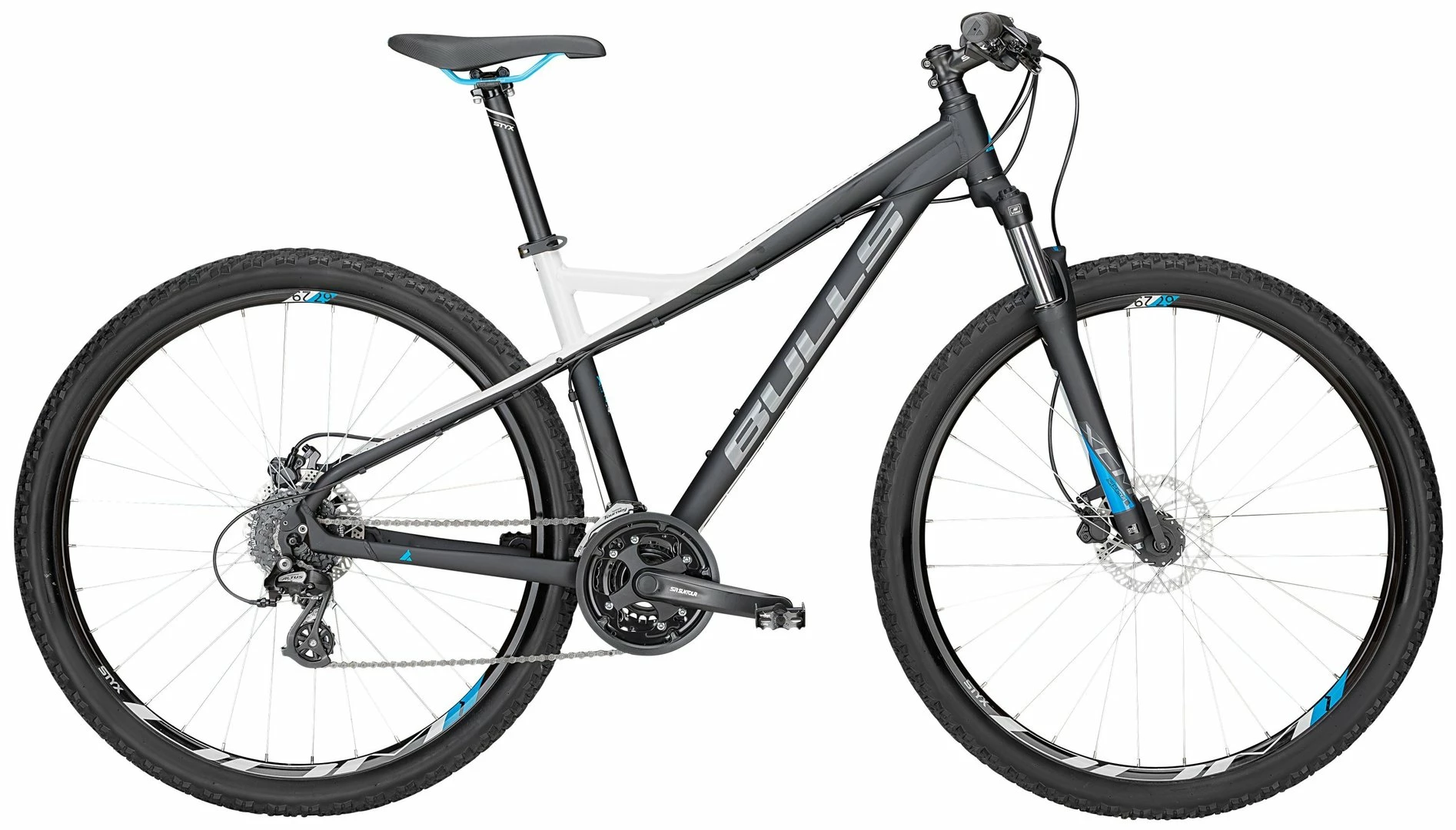 7005 Alu Rahmen, Suntour XCM Federgabel einstellbar, 24-Gang Altus Schaltwerk und Schalthebel, Tourney Umwerfer, Suntour Tretlager, Formula Naben, Tektro HD-M285 hydr. Disc-Bremsen, STYX DDM-1 Disc Felgen, STYX Lenker, Vorbau und Sattelstütze, Supero Edge Reifen (29×2,25 Zoll)