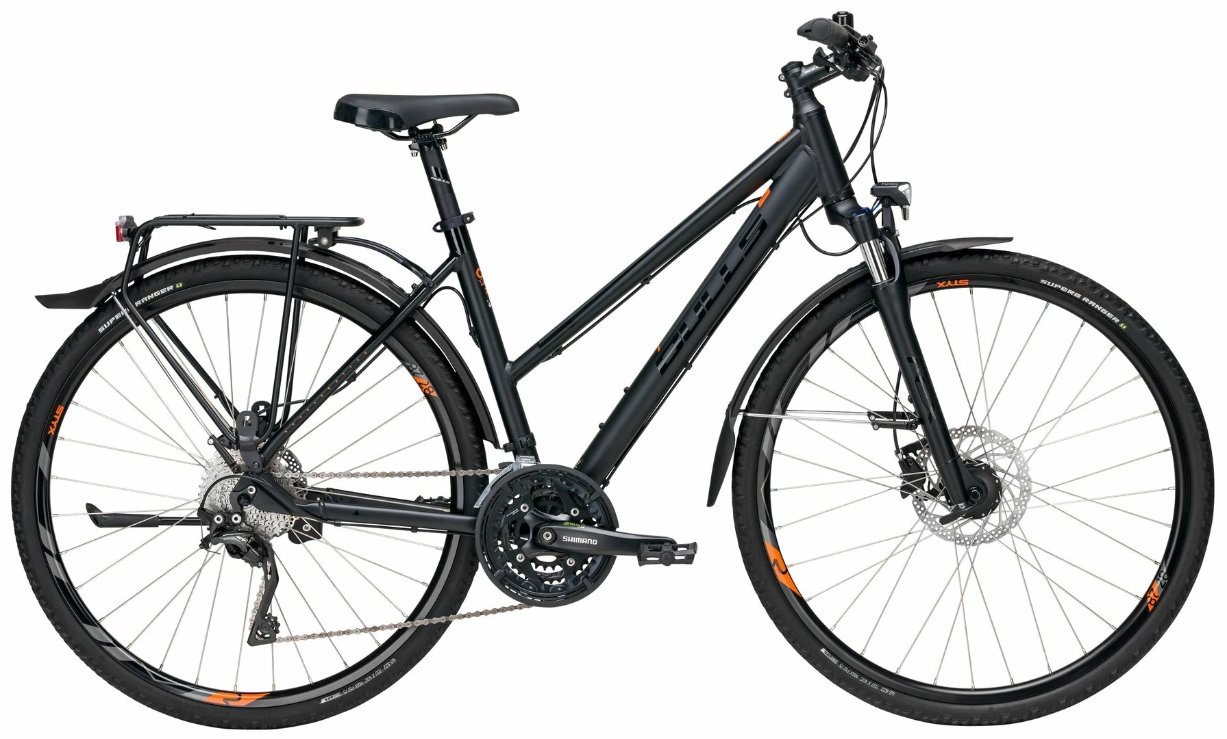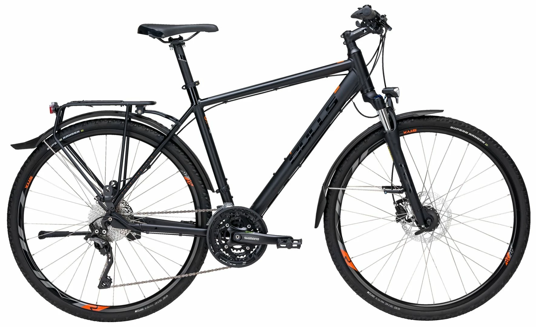 7005-Alu-Biaxial-Rahmen, Suntour NEX-DS-HLO Federgabel, 30-Gang Deore XT Schaltwerk, Deore Umwerfer und Schalthebel, T521 Kurbeln (26-36-48 Zähne), Shimano MT201 Disc-Bremsen (160/180mm), DDM-2 Hohlkammer-Felgen, Nabendynamo, 30 Lux LED-Lampe mit Sensor und Standlicht, Standrücklicht, Gepäckträger, SKS Velo 47 Trekking Steckbleche, Hebie FIX-40 Ständer