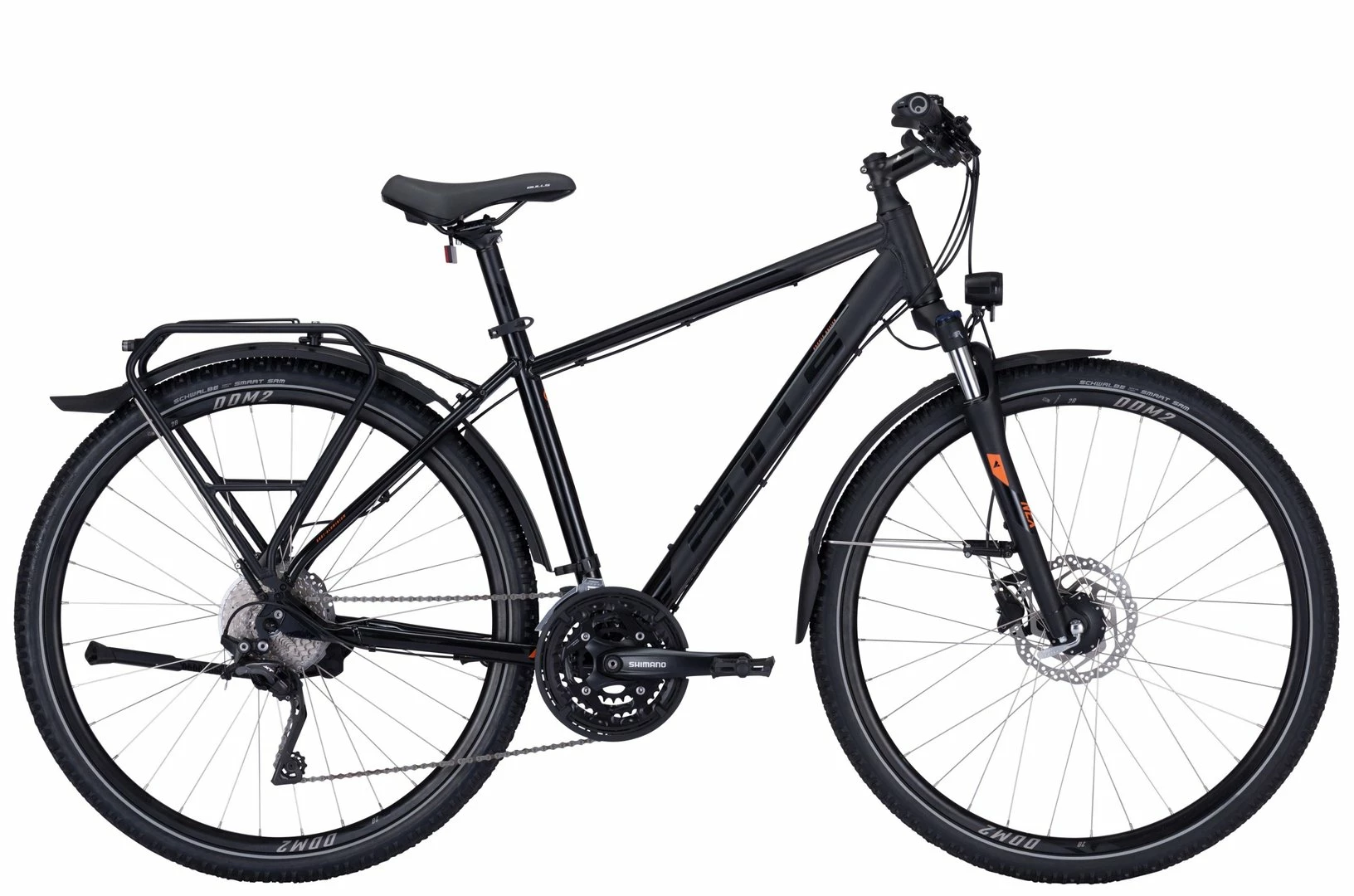 6061-Alu-Biaxial-Rahmen, Suntour NEX-DS-HLO Federgabel, 30-Gang Deore XT Schaltwerk, Deore Umwerfer und Schalthebel, T521 Kurbeln (26-36-48 Zähne), Shimano MT201 Disc-Bremsen (160/180mm), DDM-2 Hohlkammer-Felgen, Nabendynamo, 50 Lux LED-Lampe mit Sensor und Standlicht, Standrücklicht, MonkeyLoead-T Gepäckträger, SKS Velo 55 Trekking Steckbleche, Schwalbe Smart Sam Reifen (47-622), Pletscher Flex KSA-40 Ständer