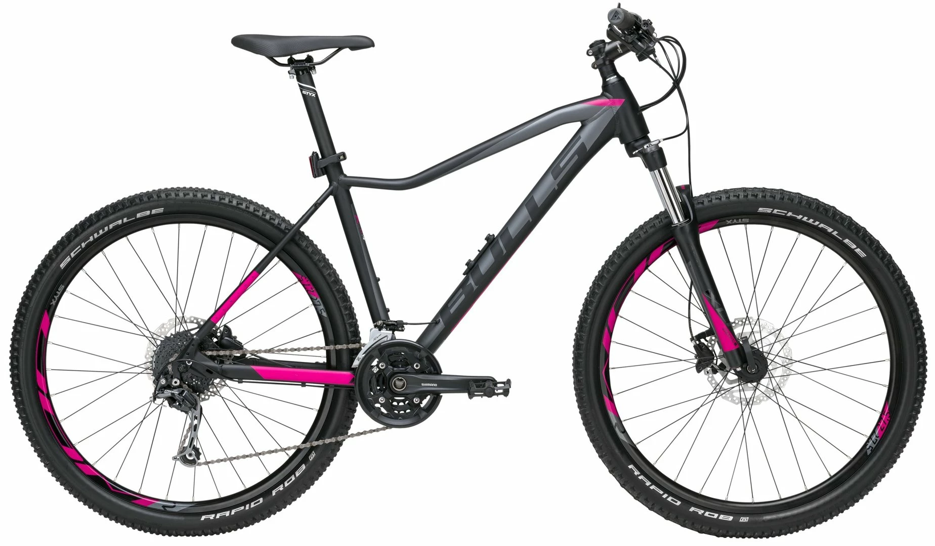 7005 Alu Rahmen mit tapered Steuerrohr und innenverlegten Kabeln (Damen Geometrie), Suntour XCM Federgabel mit Remote-Lockout, 27-Gang Deore Schaltwerk, Alivio Schalthebel Umwerfer, MT300 Tretlager (22-30-40), Formula Naben, Shimano MT201 Disc-Bremsen (180/160mm), STYX DDM-2 Disc Felgen, STYX Lenker, Vorbau und Sattelstütze, Rapid Rob Reifen, Monkey-Link Halter vormontiert