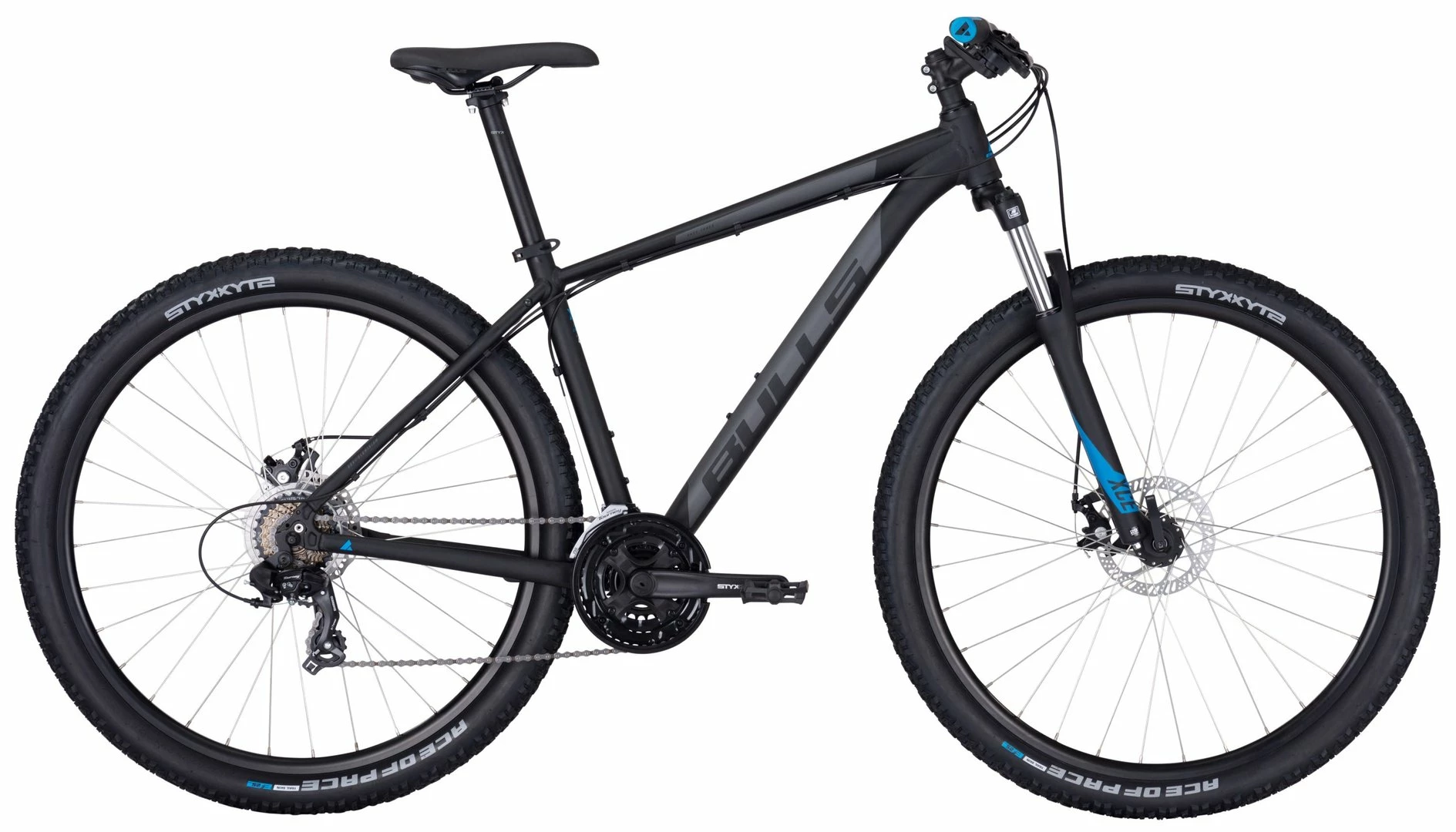6061 Alu Rahmen, Suntour XCE-28 Federgabel einstellbar, 21-Gang Tourney TY300 Schaltwerk, EF-41 Schalthebel, Tourney Umwerfer, STYX Tretlager, Aluminium Naben, Tektro MD-M280 Disc-Bremsen, STYX Alu Felgen, STYX Lenker, Vorbau, Sattelstütze, Sattel und Reifen