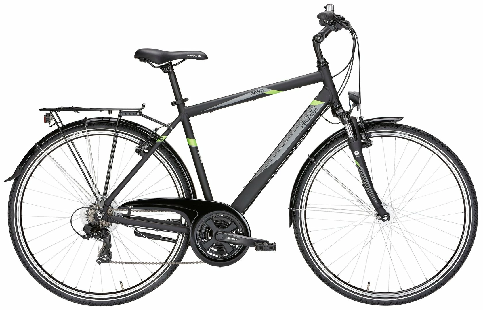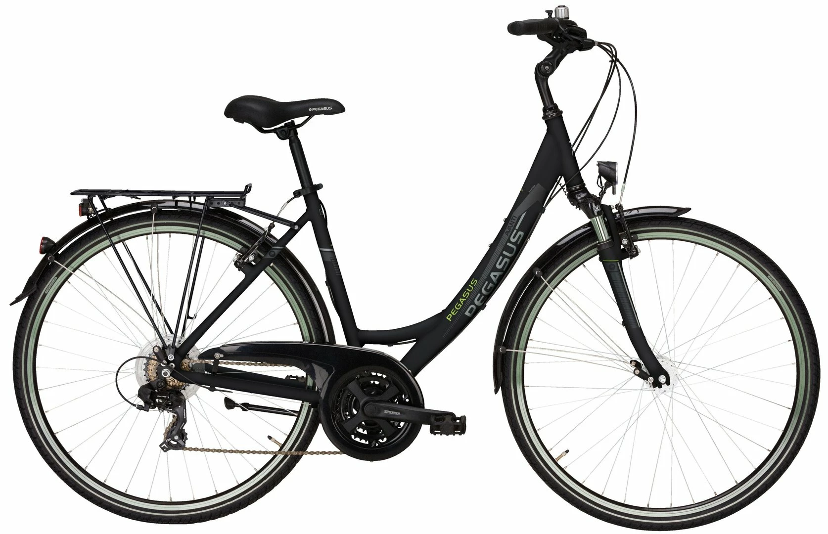 Alu Rahmen, Suntour CR-100 Federgabel, Shimano Tourney 21-Gang Schaltwerk und Umwerfer, Suntour Kurbeln mit gekapseltem Lager, Altus EZ-Fire Schalthebel, Alu V-Bremsen, Hohlkammer-Felgen, verstellbarer Vorbau, Nabendynamo, 15 Lux LED-Lampe, Standrücklicht