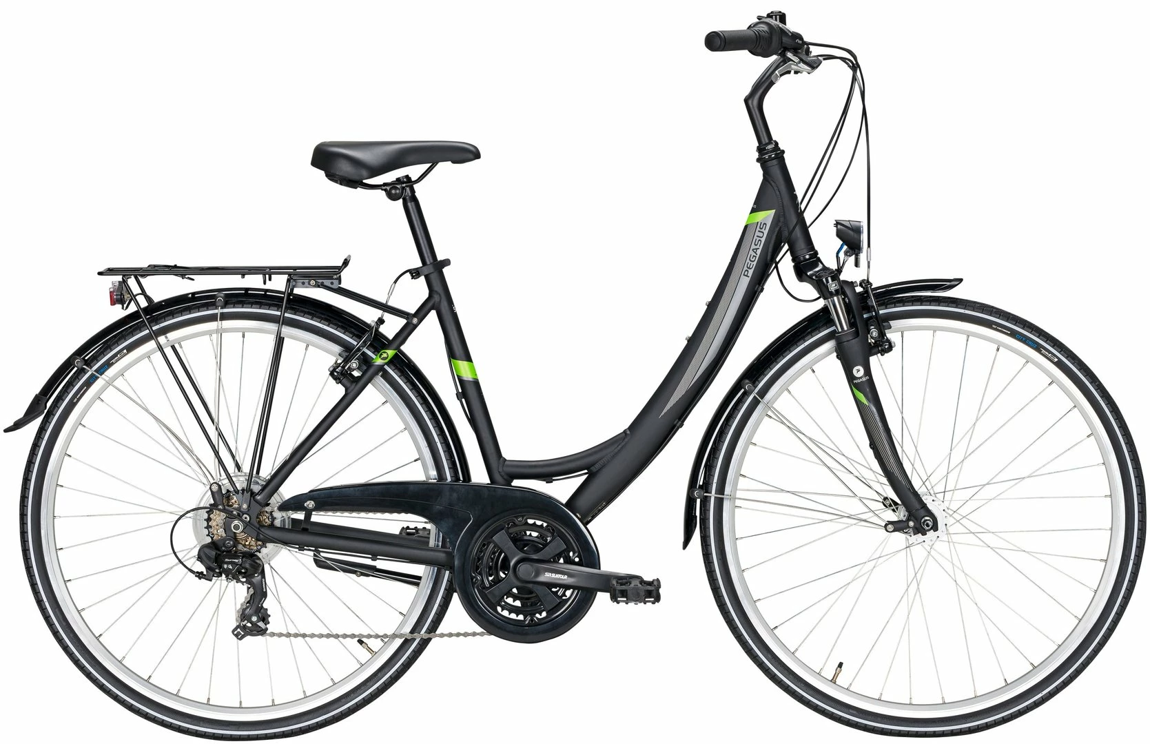Alu Rahmen, Suntour CR-100 Federgabel, Shimano Tourney 18-Gang Schaltwerk, Umwerfer und Revoshift Schalthebel (Drehgriffe), Suntour Kurbeln mit gekapseltem Lager, Alu V-Bremsen, Hohlkammer-Felgen, Nabendynamo, 30 Lux LED-Lampe, Standrücklicht, Kettenschutz