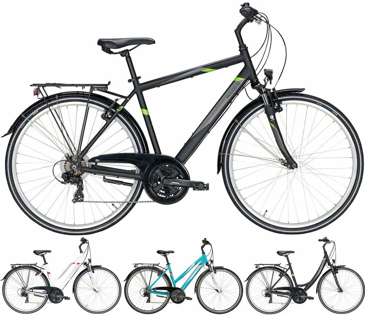 Das Avanti bietet die klassischen Merkmale des Trekkingbikes zum kleinen Preis. Dazu gehört die 18-Gang-Kettenschaltung mit drei Kettenblättern vorne, ebenso eine stoßmindernde Federgabel und helle LED-Beleuchtung mit ausfallsicherem Nabendynamo und Standlicht hinten. Verzögert wird mit kräftigen, einfach zu wartenden Felgenbremsen. Mit dem geschwungenen Lenker sitzt es sich schön aufrecht, was im Alltag und auf Touren sehr angenehm ist. Das mit einem soliden Gepäckträger ausgestattete Trekkingbike ist in drei Rahmenvarianten verfügbar und wird in mehreren attraktiven Farbvarianten angeboten.