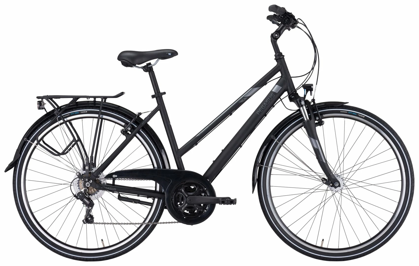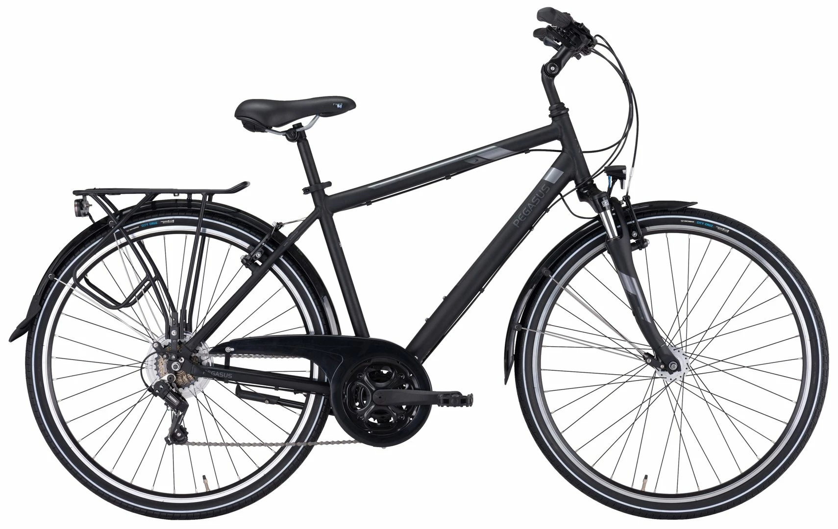 Alu Rahmen, Suntour CR-7V Federgabel, Shimano Tourney 21-Gang Schaltwerk und Umwerfer, Altus EZ-Fire, Samox Kurbeln mit gekapseltem Lager, Alu V-Bremsen, Hohlkammer-Felgen, verstellbarer Vorbau, Nabendynamo, 30 Lux LED-Lampe, Standrücklicht, Kunststoffschutzbleche, Kettenschutz