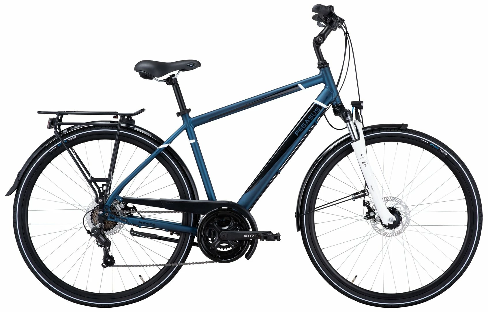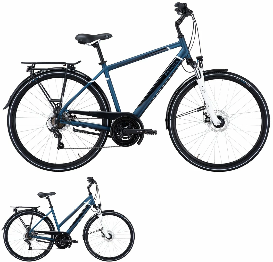 6061 Alu-Rahmen, Suntour NEX-DS Federgabel, Tourney Schaltwerk und Umwerfer, Altus Schalthebel, STYX Kurbeln (28-38-48), Tektro MD-M280 mechanische Scheibenbremsen (160/160mm), Hohlkammer-Felgen, Vee-Tire City-Cruz Reifen (44-622), verstellbarer Vorbau, Ergo-Griffe, Freeway Sattel, Nabendynamo, 30 Lux LED-Lampe, Standrücklicht