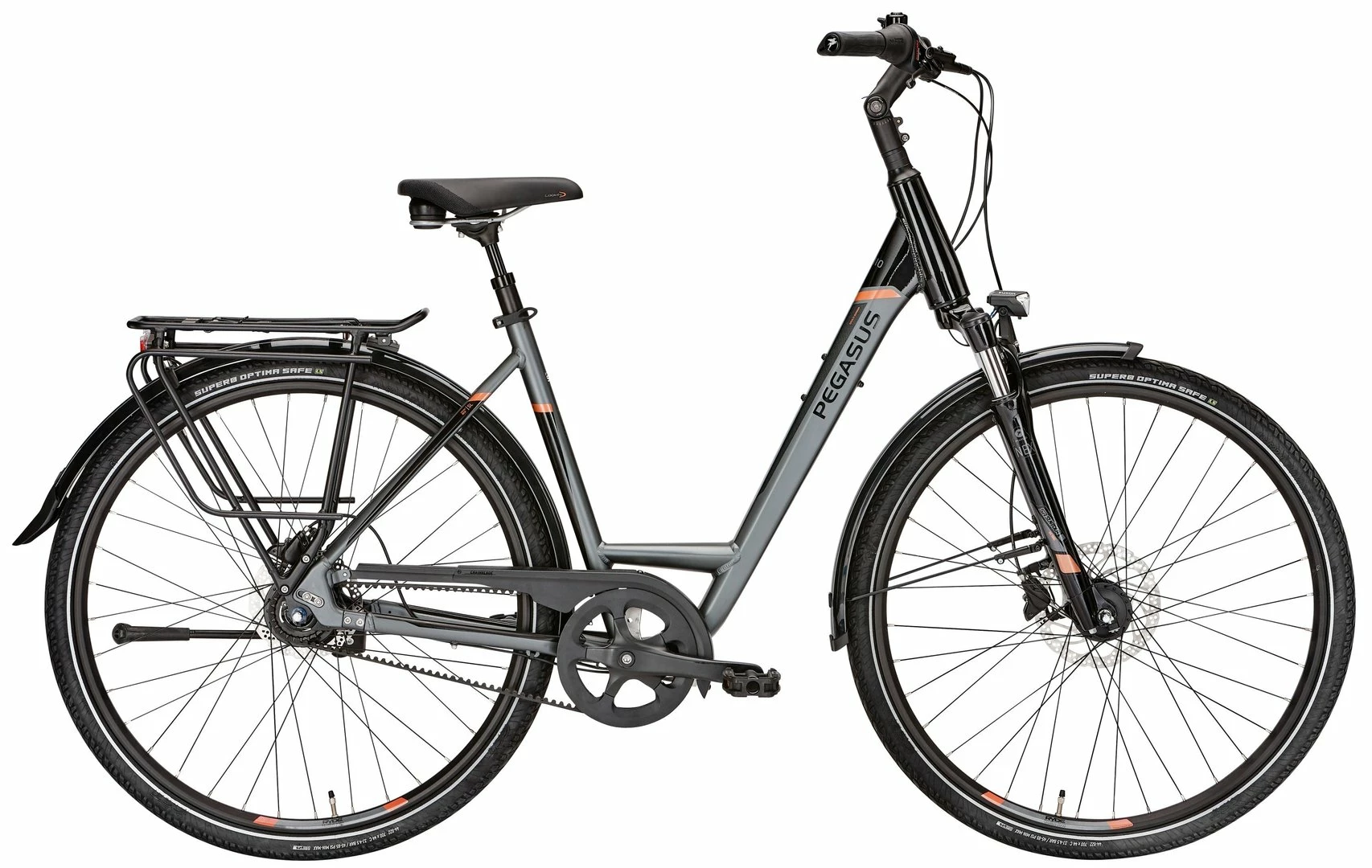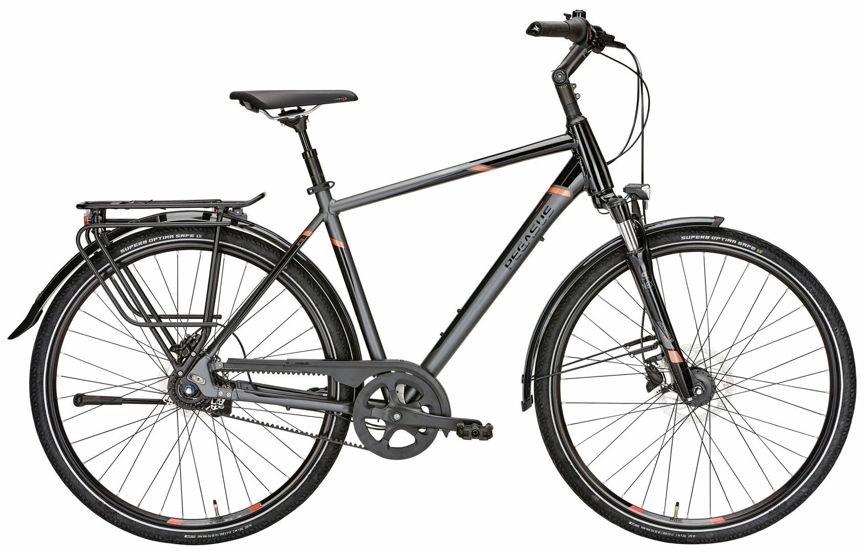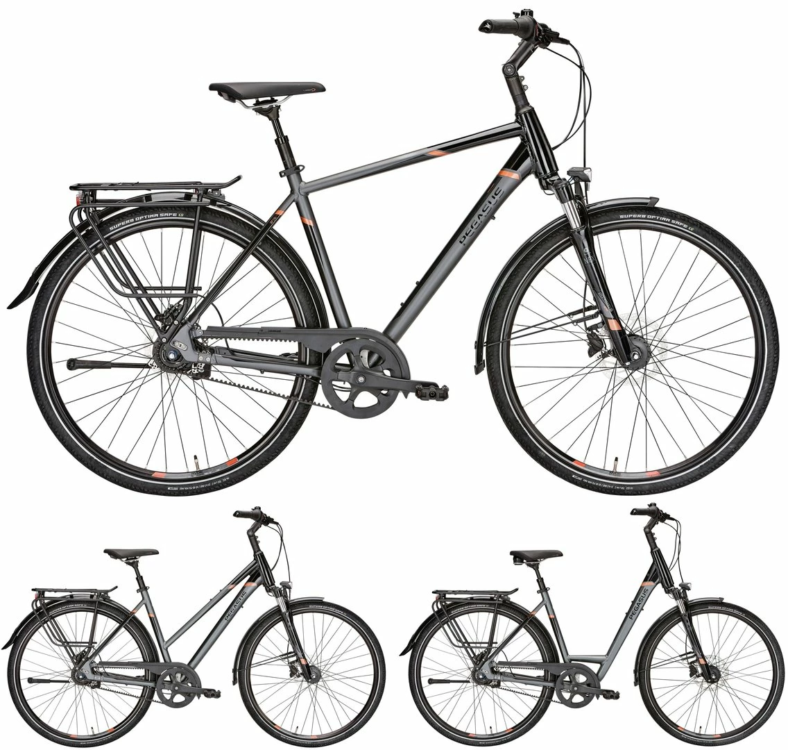 “Wenn PEGASUS Qualität auf Riemenantrieb und Nabenschaltung trifft, dann entsteht maximaler Fahrspaß bei minimalem Wartungsaufwand. Statt Kette macht der Carbon-Riemen nicht nur Schluss mit schmutzigen Händen, sondern bietet in Kombination mit der robusten Shimano 8-Gang-Nabe beste Fahreigenschaften. Dazu sorgen die hydraulischen Shimano Scheibenbremsen bei jeder Witterung für optimales Bremsverhalten. Komfort-Komponenten wie der breite Lenker und die Federgabel machen das Fahren noch angenehmer, sicherer wird es durch die leistungsstarke Lichtanlage und die pannengeschützten Reifen.”