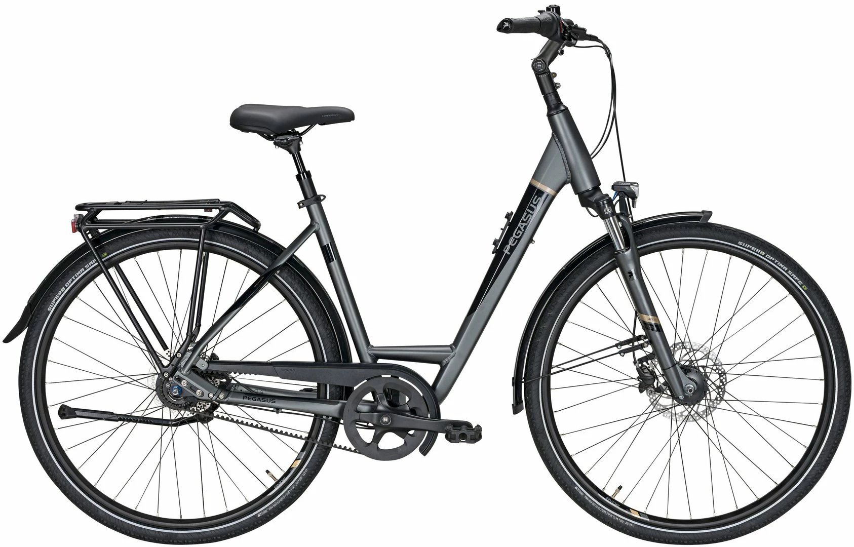 Beim in drei Rahmenformen verfügbaren Tourenbike liegt der Focus auf Fahrkomfort und Wartungsarmut. Die angenehm aufrechte Sitzhaltung des Premio SL Belt 8 ist langstreckentauglich und erlaubt dank geschwungenem Lenker eine entspannte Positionierung der Arme, wobei eine hochwertige Federstütze sowie eine Federgabel mit 63 mm Weg für Komfort sorgen. Der Übersetzungsumfang der 8-Gang-Nabeschaltung ist groß genug für Touren und Alltagsfahrten; in Sachen Wartungsarmut ist die Kombination aus Getriebeschaltung und Zahnriemenantrieb nicht zu schlagen. Starke hydraulische Scheibenbremsen verbinden kurze Anhaltewege in jeder Situation mit feinfühliger Dosierbarkeit. Eine LED-Lichtanlage mit Standlicht-Automatik vorne wie hinten und ausfallsicherem Nabendynamo sorgt für gute Sicht und Sichtbarkeit, und die 44 mm breiten Reifen bieten einen guten Kompromiss aus Leichtlauf und Vibrationsdämpfung. Am elegant geformten Systemgepäckträger lässt sich die Office-Bag ebenso leicht befestigen wie Reisetaschen.