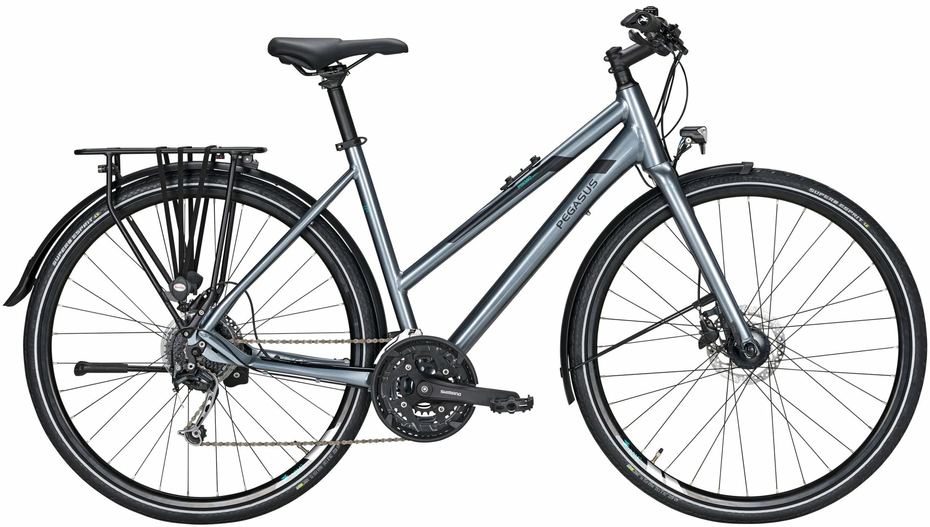 Das sportliche Leichtgewicht unter den Trekkingbikes wendet sich an Alltags- und Tourenfahrer, die in etwas flacherer Sitzhaltung Tempo machen wollen. Das Premio Superlite 27 ist mit Starrgabel auf Handlichkeit und direktes Lenkverhalten abgestimmt und rollt auf den etwas schmaleren Reifen besonders leicht; der Lenker ist weniger stark gebogen als bei Tourenbikes und mit ergonomischen Griffen versehen. Keinerlei Abstriche werden bei der Ausstattung gemacht: Mit 3×9-Gang-Kettenschaltung und starken, bestens dosierbaren Scheibenbremsen ist das Superlite 27 auf jedem Terrain zuhause; am soliden Systemgepäckträger erlaubt der zusätzliche Spanngurt die Befestigung einer Jacke oder kleineren Tasche. Mit 60 Lux hellem LED-Strahler und Tagfahrlicht ist die Lichtanlage des Superlite auf beste Sichtbarkeit bei hohem Tempo abgestimmt; bei Dunkelheit bewährt sich die Standlicht-Automatik vorne wie hinten.