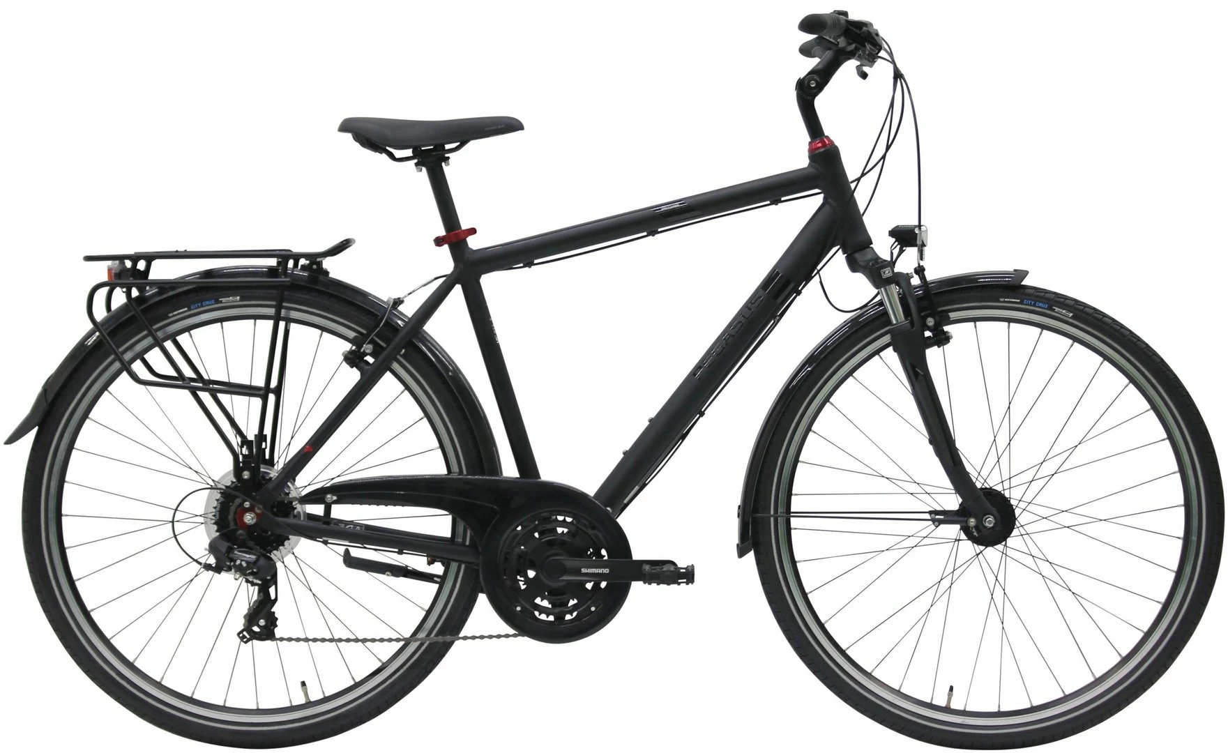 7005 Alu-Rahmen, Suntour CR-7V Federgabel, Altus Schaltwerk und Schalthebel, Tourney Umwerfer und Kurbeln (48 Zähne), Formula Kassettennabe, V-Bremsen, DBM-2 Hohlkammer-Felgen, Vee Tire Santa Cruz Reifen (44-622), verstellbarer Vorbau, 2-Bolt Sattelstütze, Nabendynamo, 30 Lux LED Sensor-Lampe, Standlicht vorne und hinten