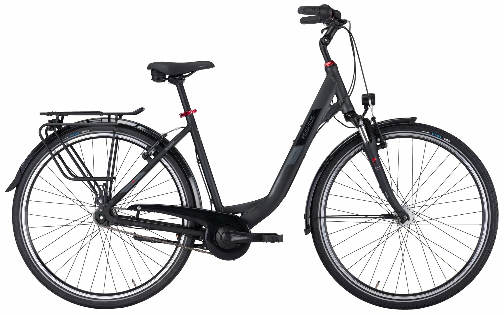 6061 Alu-Rahmen, Suntour CR-8V-P Federgabel, Shimano Nexus Nabenschaltung mit Revoshift Schalthebel und Rücktritt, Alu Kurbeln, V-Bremsen, DBM-2 Aluminium Hohlkammer-Felgen, verstellbarer Vorbau, Trekking-Lenker, Nabendynamo, 50 Lux LED Lampe, Standlicht, Gepäckträger mit Monkeyload-T Stecksystem, Vee Tire City Cruz Reifen (44-622), Selle Royal Essenza Sattel