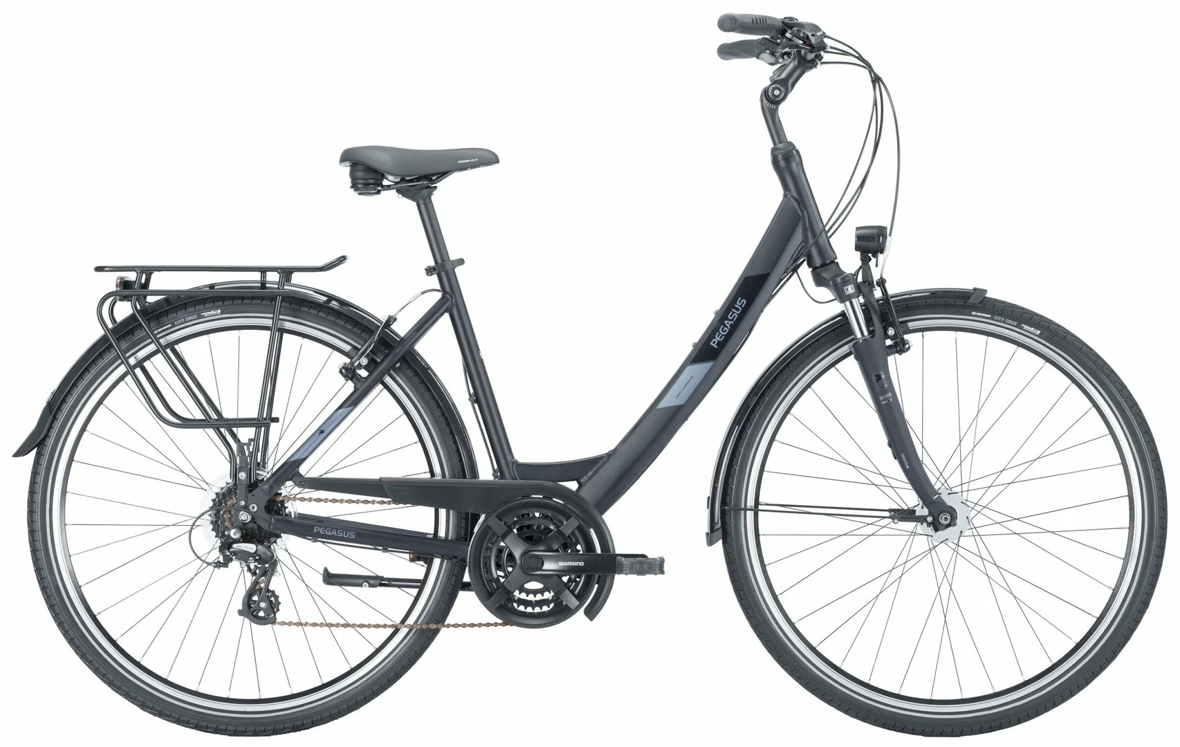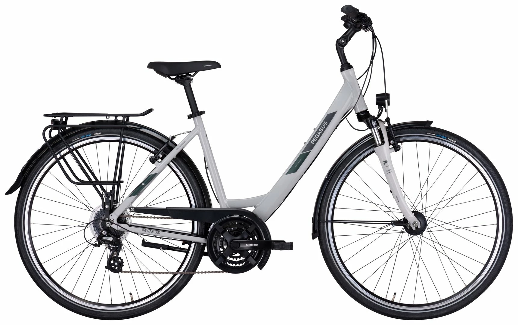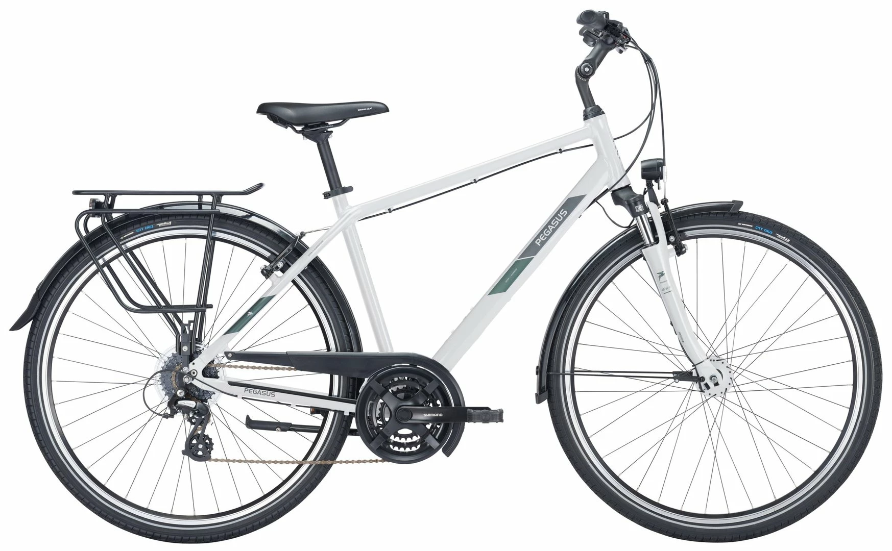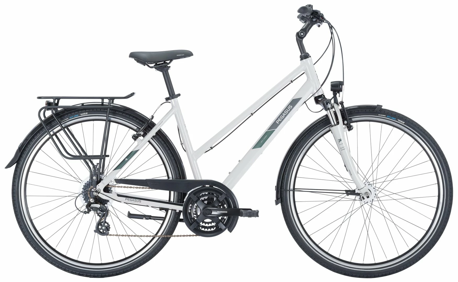 6061 Alu-Rahmen, Suntour CR-8V-P Federgabel einstellber, Altus Schaltwerk und Schalthebel, Tourney Umwerfer und Kurbeln (48 Zähne), Formula Kassettennabe, V-Bremsen, DBM-2 Hohlkammer-Felgen, Vee Tire Santa Cruz Reifen (44-622), verstellbarer Vorbau, 2-Bolt Sattelstütze, Nabendynamo, 50 Lux LED Lampe, Standrücklicht, ergonomische Lenkergriffe