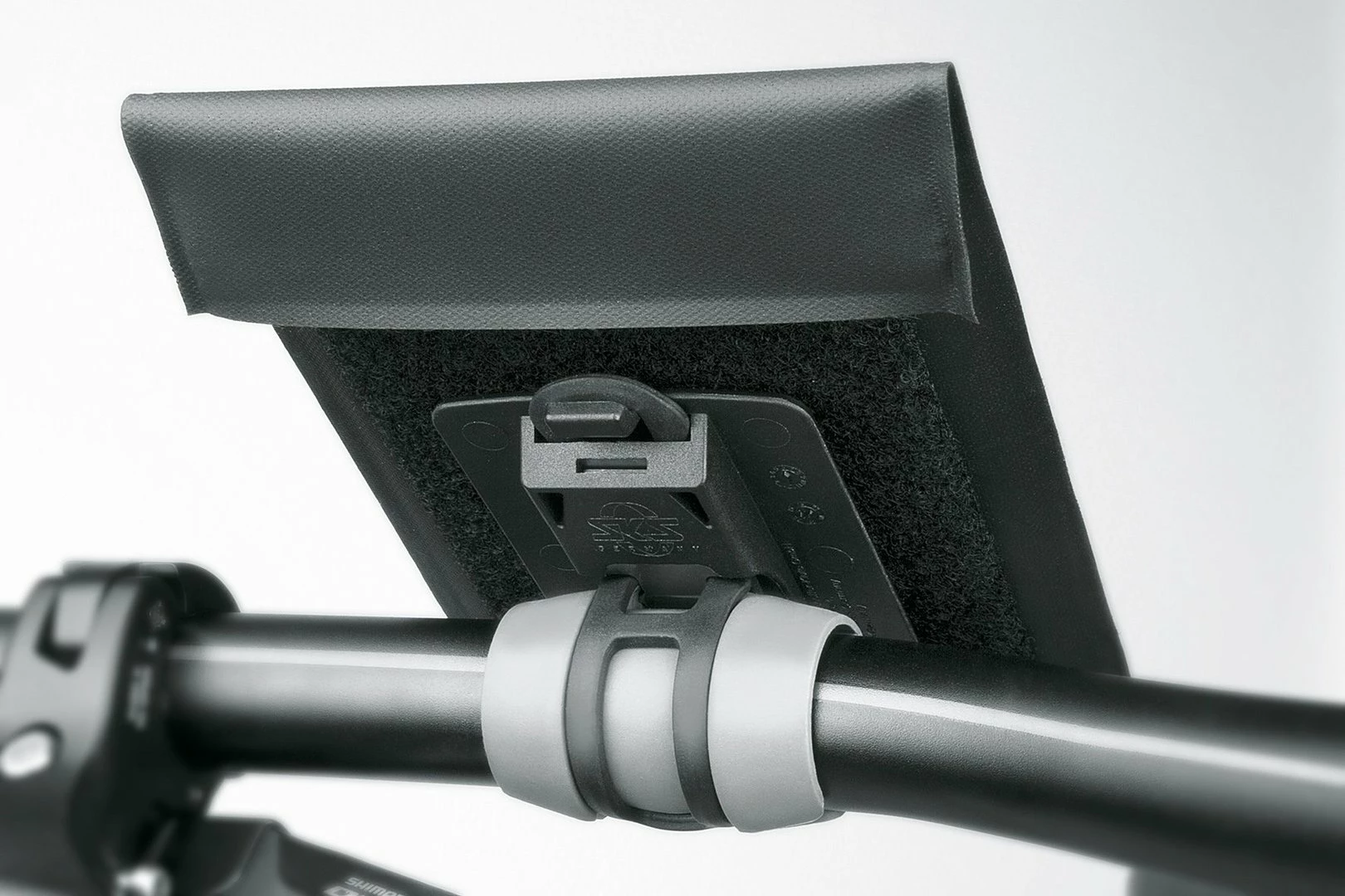 Mit dieser innovativen Halterung lässt sich Ihr Smartphone in Sekunden-schnelle am Lenker Ihres Fahrrads, Kinderwagens etc. befestigen – und das komplett ohne Werkzeug! Die mitgelieferte Tasche schützt vor Wasser. Das Smartphone lässt sich dabei weiter bequem durch die durchsichtige Transmitterfolie bedienen. Maximale Größe des Smartphones 144 x 76 x 9 mm. z.B. iPhone 6/7/8