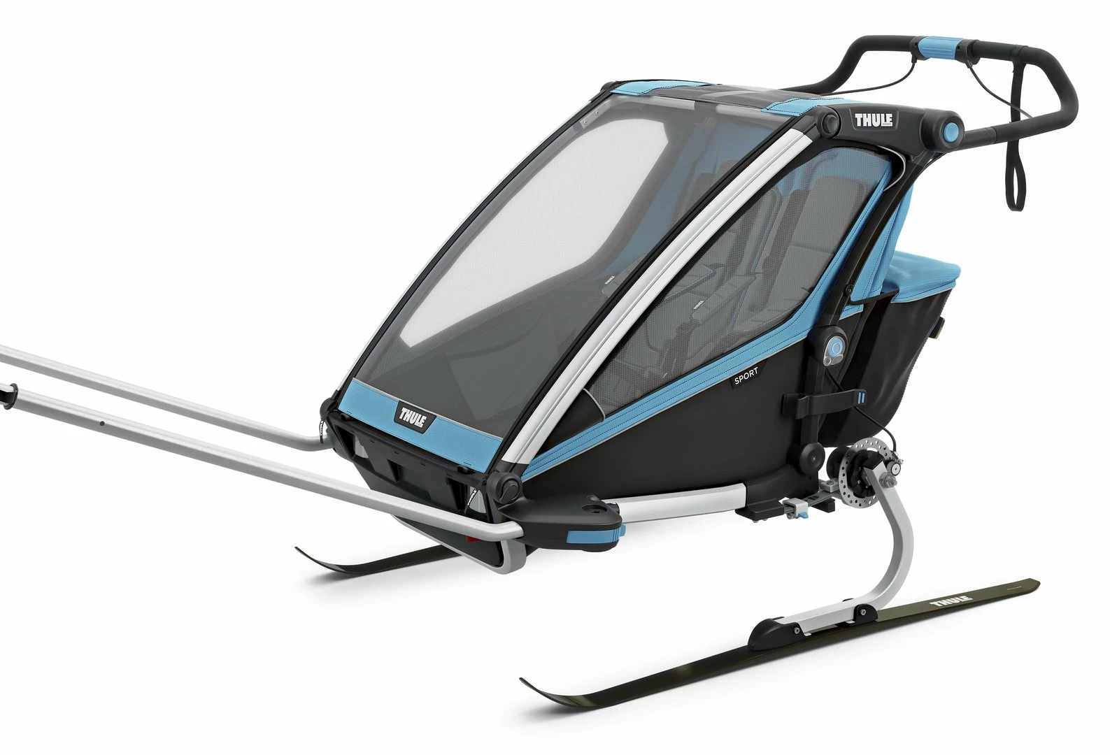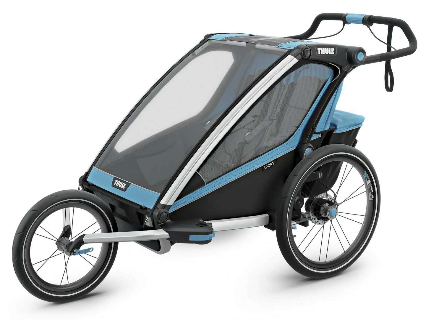 - Handbetätigte Scheibenbremse – für eine verbesserte Kontrolle bei starkem Gefälle und beim Laufen
